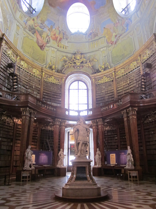 located in Hofburg Palace – If you read my post about Budapest, you know we are wont to pursue “Beauty and the Beast” libraries. This one, claimed by some to be the most beautiful library in the world, was everything we hoped for. Not only was it gorgeous, but there was an interesting exhibit about WWI, since 2014 marks the 100th anniversary of its beginning. We thought it would be free to enter, but we happily paid the €7 per ticket. - St. Stephen’s Cathedral – The centuries-old church at the heart of the city. We paid the €16 for the all-access pass, which includes more space to explore the cathedral and an insightful audio tour (though I read Rick Steves has one too you can download for your smartphone). We spent over an hour in the treasures museum, which we had all to ourselves shortly after the cathedral opened. The catacombs tour was also creepy-interesting, and though the pass included elevators to both towers, we only went to the north tower (the one with the bell) since it was rainy.